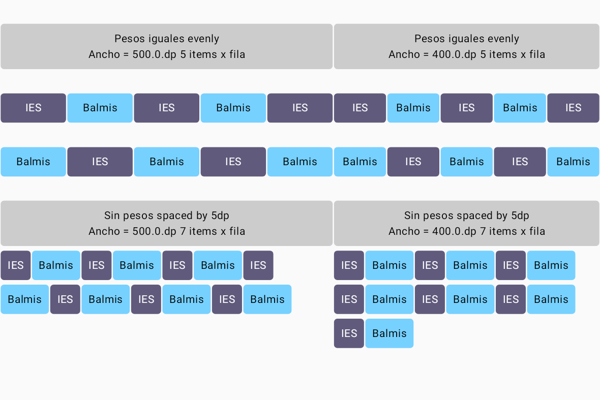 background - Dibuja una forma de color sólido detrás del composable.clickable - Especifica un controlador que se llamará cuando se haga clic en el composable. También causa un efecto de ondulación cuando se realiza el clic.clip - Recorta el contenido composable a una forma especificada.fillMaxHeight - El composable se dimensionará para ajustarse a la altura máxima permitida por su padre.fillMaxSize - El composable se dimensionará para ajustarse a la altura y ancho máximos permitidos por su padre.fillMaxWidth - El composable se dimensionará para ajustarse al ancho máximo permitido por su padre.offset - Posiciona el composable a la distancia especificada desde su posición actual a lo largo del eje x e y.padding - Agrega espacio alrededor de un composable. Se pueden utilizar parámetros para aplicar espaciado a los cuatro lados o para especificar un relleno diferente para cada lado.rotate - Rota el composable en su punto central por un número especificado de grados.scale - Aumenta o reduce el tamaño del composable por el factor de escala especificado.scrollable - Habilita el desplazamiento para un composable que se extiende más allá del área visible del diseño en el que está contenido.size - Se utiliza para especificar la altura y el ancho de un composable. En ausencia de una configuración de tamaño, el composable se dimensionará para acomodar su contenido (denominado envoltura).dp: Este es un valor de dimensión que representa píxeles independientes de la densidad de píxeles (dpi) del dispositivo. Por ejemplo:
