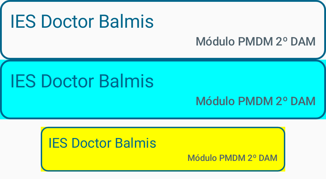 @Preview(showBackground = true, name = "CabeceraPreview") @Composable fun Cabecera() { ProyectoBaseTheme { Column( modifier = Modifier .fillMaxWidth() .border( width = 2.dp, color = MaterialTheme.colorScheme.primary, shape = MaterialTheme.shapes.medium ) .padding(12.dp) ) { Text( text = "IES Doctor Balmis", style = MaterialTheme.typography.titleLarge, color = MaterialTheme.colorScheme.primary ) Text( modifier = Modifier.align(Alignment.End), text = "Módulo PMDM 2º DAM", style = MaterialTheme.typography.titleSmall, color = MaterialTheme.colorScheme.secondary ) } } }