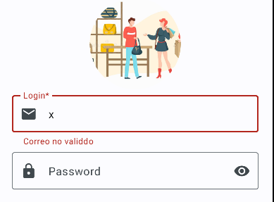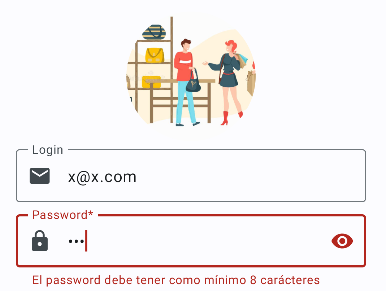 Habrá que validar las entradas incorrectas de los TextField, de forma que se mostrarán los mensajes de error: indicando que no pueden estar vacíos, para el correo que debe cumplir el formato de correo y para el password que debe ser mayor o igual a 8.
