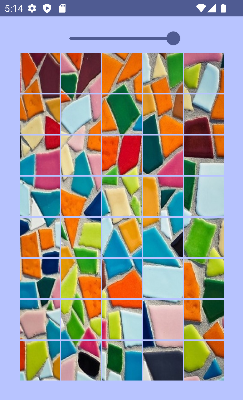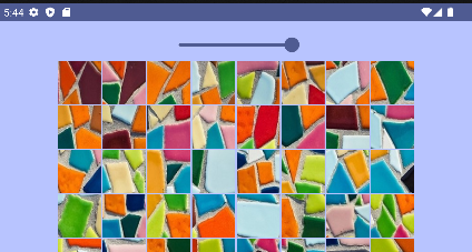 El ejercicio trata de crear un composable MosaicoScreen que muestre la disposición de las imágenes usando un layout FlowRow, este tipo de contenedor permite distribuir el contenido de forma fluida dependiendo del ancho de la pantalla o de la disposición del dispositivo (giraremos el dispositivo para ver su comportamiento con diferentes anchos), hasta un máximo de elementos establecidos. Para fingir los distintos tamaños de ancho, vamos a disponer de un Slider que modificará la variable del máximo elementos por fila.