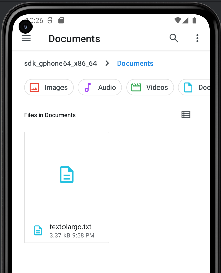 Al pulsar sobre el botón se abrirá la app administrador de archivos (Files) instalada por defecto en el sistema, para que podamos seleccionar un archivo de texto largo. Previamente subido mediante el Device Explorer en la carpeta Documents de la memoria interna del dispositivo:
