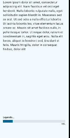El siguiente paso será añadir a la pantalla de la aplicación un texto con scroll y una barra de progreso, para relacionar el movimiento de esta con la carga del texto podemos usar la longitud de este. El aspecto durante la carga sería algo como la imagen a la derecha.