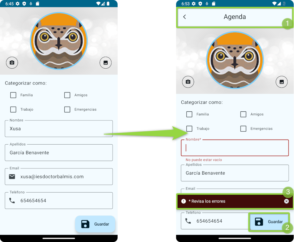 ... is ContactoEvent.OnDismissError -> { validacionContactoState = ValidacionContactoUiState() } is ContactoEvent.OnSaveContacto -> { validacionContactoState = validadorContacto.valida(contactoState) if (!validacionContactoState.hayError) { ... // Guardamos o editamos el contacto } else { informacionEstadoState = InformacionEstadoUiState.Error( mensaje = validacionContactoState.mensajeError!!, onDismiss = { informacionEstadoState = InformacionEstadoUiState.Oculta() } ) } } ...