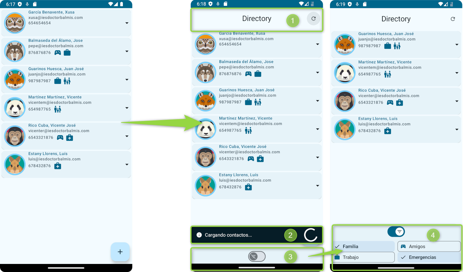 TopAppBar con un título y un botón de acción para actualizar la lista de contactos.SnackbarCommon que definimos en el paso anterior.BottomSheet) que contendrá el componente con FilterChips que definimos en temas anteriores y que se encuentra en el .ui.features.components.SeleccionCategorias.kt. Este composable nos permitirá filtrar los contactos por categorías.sheetDragHandle específico para nuestra hoja inferior, que será un componente Switch que nos permitirá activar o desactivar los filtros.Nota
