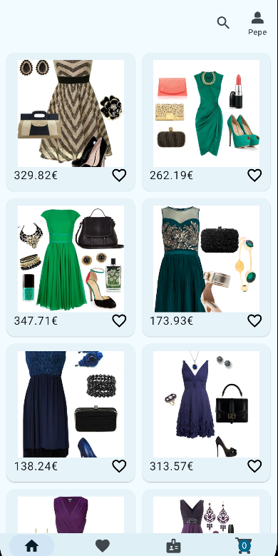 - Funcionalidad del icono favoritos, para que haga un filtrado de los artículos que aparecen en la lista de id de favoritos del cliente, para ello fíjate como están codificados los eventos OnClickListarFavoritos y OnClickFavoritos.