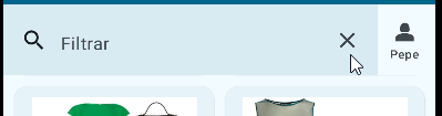 Además al pulsar sobre el icono de búsqueda, se mostrará en la TopAppBar un SearchBar dependiendo del state estaFiltrando, al pulsar sobre la X cambiará el state estaFiltrando.