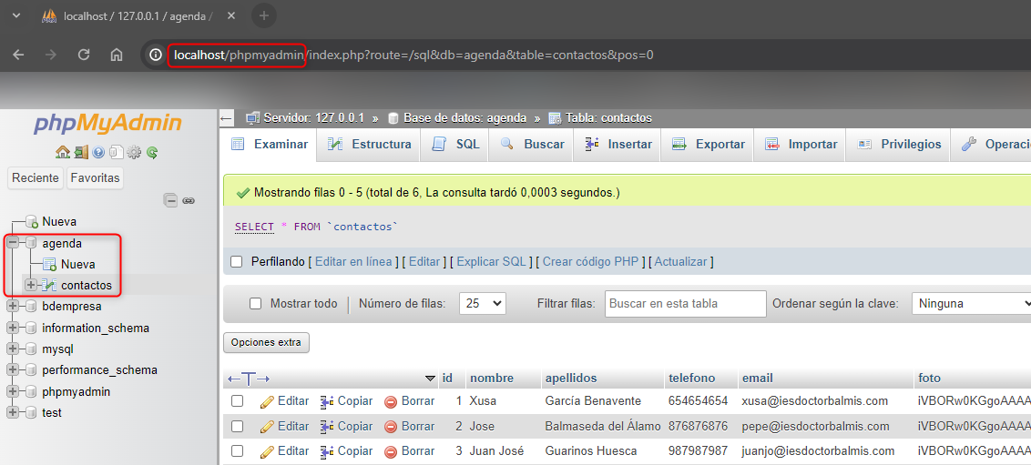 Para acceder a phpMyAdmin debes ir a la url http://localhost/phpmyadmin/ y ejercutar agenda_mysql_datos.sql en la pestaña SQL. Tras hacerlo, te debe aparecer la base de datos agenda con la tabla contactos como se muestra en la imagen de ejemplo.