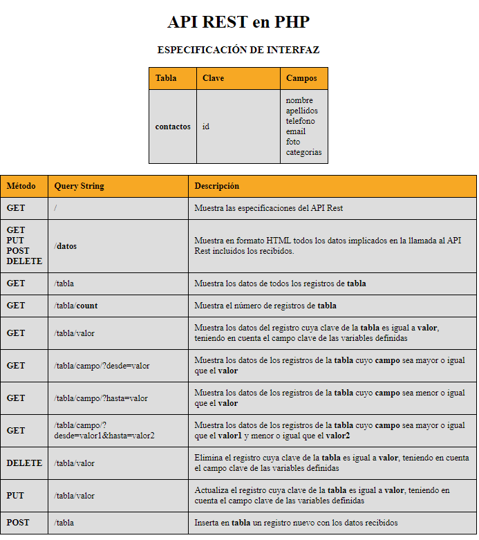 Debes instalar un servidor web Apache con PHP y MySQL. En el módulo de Acceso a Datos se ha utilizado xampp. En la carpeta xampp\htdocs, o en la carpeta pública de tu servidor web, debes descomprimir el fichero apiRest-PHP-Session.zip y renombrar su contenido por ejemplo por la BD que quieras utilizar. Supongamos que queremos crear el servicio de API Rest para la Agenda que hemos ido creando durante el curso. En este caso renombraremos la carpeta apiRest-PHP-Session por agenda como se aprecia a la derecha agenda.